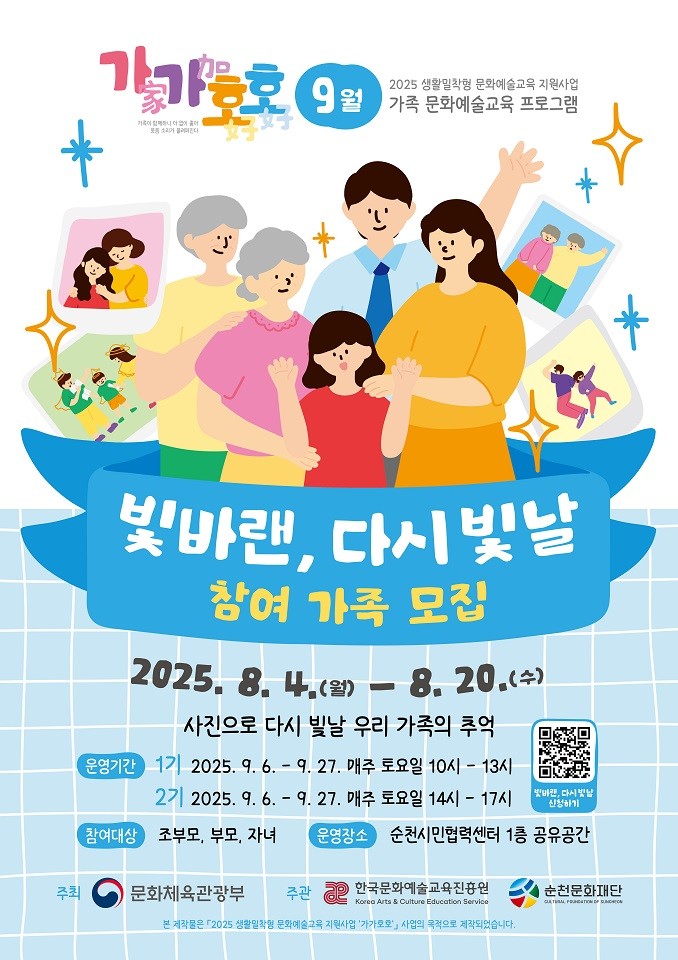 ‘가가호호’는 문화체육관광부가 주최하고 한국문화예술교육진흥원과 순천문화재단이 주관하는 사업으로, 순천문화재단은 가족 간 이해를 높이고 건강한 가족 여가문화를 만들기 위해 연중 5개의 가족 문화예술교육프로그램을 운영하고 있다.