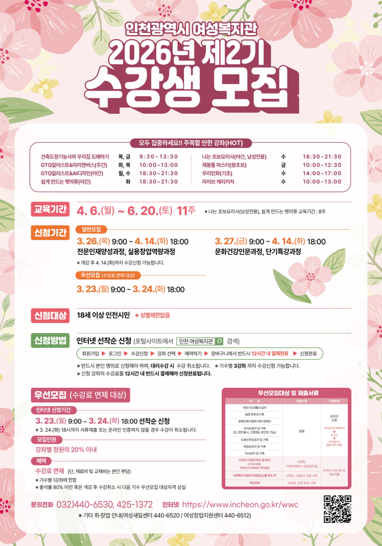 자세한 사항은 여성복지관 누리집(www.incheon.go.kr/wwc)에서 확인하거나 전화(☎032-440-6530, 425-1372)로 문의하면 된다.
