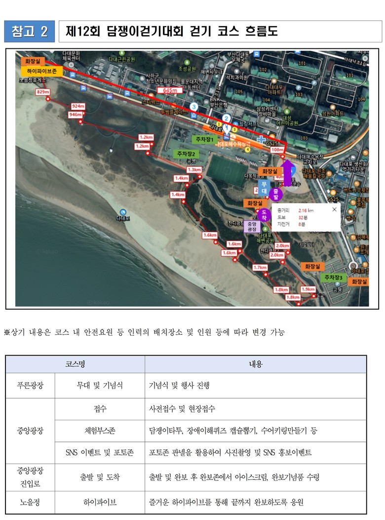 ◈ 걷기대회는 ▲다대포 해변 푸른광장 ▲다대포 낙조분수 ▲노을정 ▲다대포 생태탐방로에서 다시 출발지로 돌아오는 2.1킬로미터(km) 코스로, 완주까지 약 1시간 소요