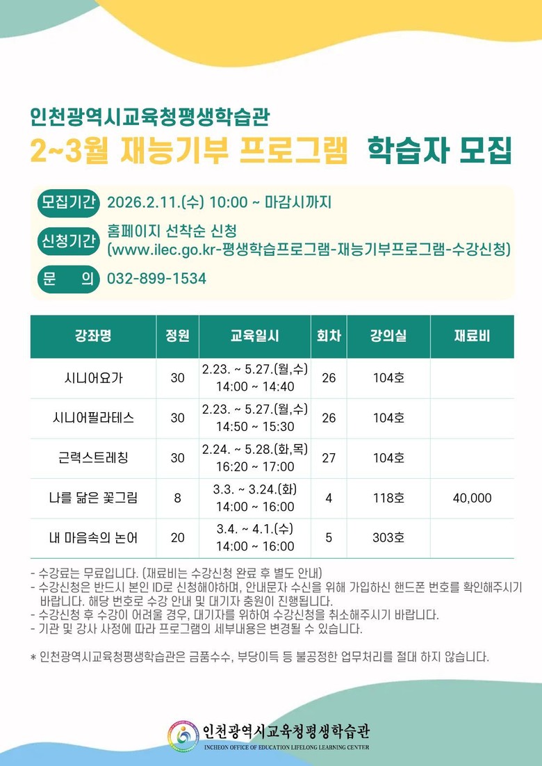 수강 신청은 11일 오전 10시부터 평생학습관 누리집에서 선착순으로 진행되며, 자세한 사항은 누리집의 공지사항을 확인하거나 평생교육부(☎ 032-899-1534)로 문의하면 된다.