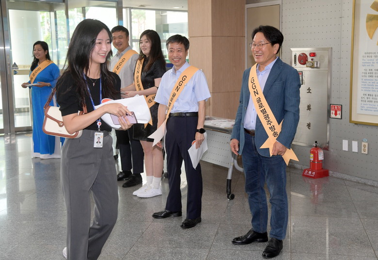 ▲ 강기정 광주광역시장이 26일 오전 시청사 입구에서 출근하는 직원들을 대상으로 광주시 출연기관인 글로벌광주방송 개편 홍보를 한 후 참석자들과 함께 기념촬영을 하고 있다. /광주광역시 제공