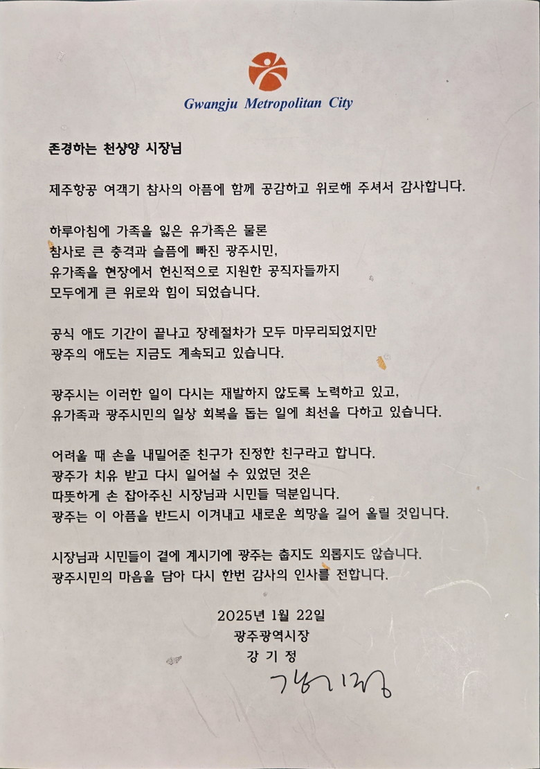 강기정 광주시장은 “제주항공 여객기 참사의 아픔에 함께 공감하고 위로해주셔서 희생자 유가족, 시민 등 모두에게 큰 위로와 힘이 됐다”며 “이러한 일이 다시는 재발하지 않도록 노력하는 한편 이들의 일상 회복을 돕는 일에 최선을 다하고 있다. 여러분 덕에 광주가 치유받고 다시 일어설 수 있었다”고 감사의 마음을 전했다.