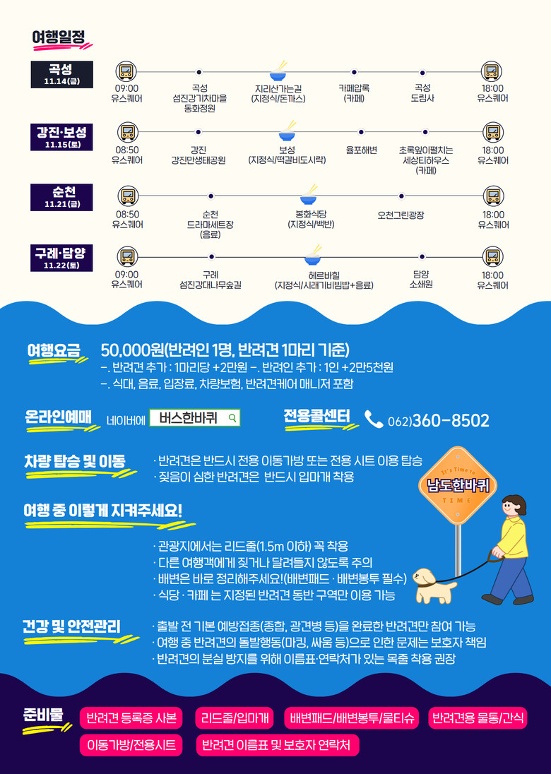 최근 반려동물을 가족처럼 여기는 ‘펫팸족(Pet+Family)’이 늘어남에 따라 기획한 이번 코스는 반려견과 함께 남도의 자연과 명소를 둘러보는 여행상품이다. 왕복 교통비, 식·음료, 관광지 입장료 등이 포함된 5만 원의 합리적 요금으로 운영된다.