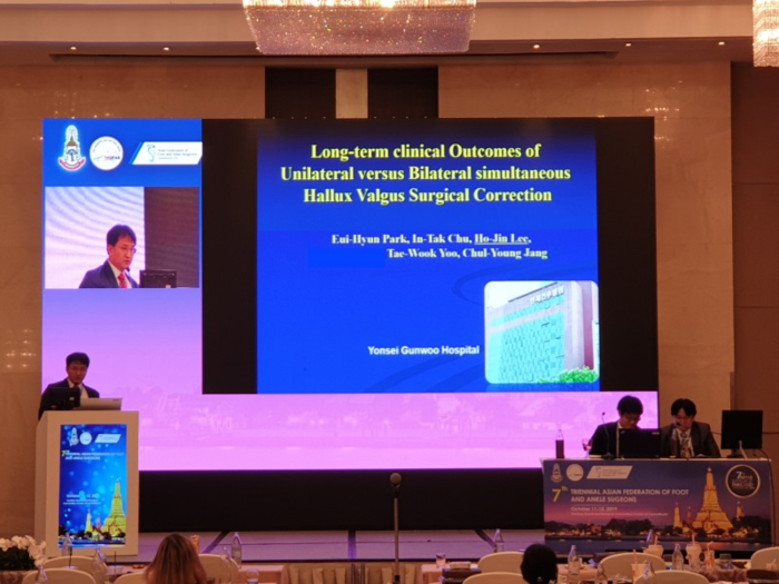 연세건우병원 족부전담팀(박의현, 주인탁, 이호진, 유태욱, 장철영 원장)이 11~12일 태국 방콕에서 개최된 2019 아시아 족부족관절 학술대회(AFFAS)에 무지외반증 수술 주제 발표자로 선정되며 또 한 번 대한민국 족부 수술의 우수성을 입증했다.