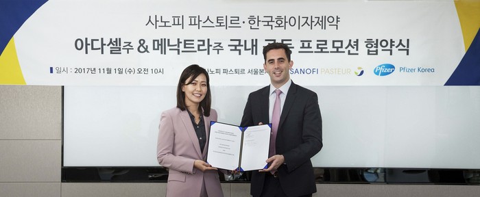 글로벌 헬스케어 기업 사노피(Sanofi)의 백신사업부인 사노피 파스퇴르㈜ (대표 밥티스트 드 클라랑스, Baptiste de Clarens, 이하 “사노피 파스퇴르”)는 지난 1일 한국화이자제약 백신사업부(조윤주 전무, 이하 “화이자”)와 아다셀주 및 메낙트라주 등 백신 2종의 국내 공동 프로모션 협약을 체결했다고 밝혔다.