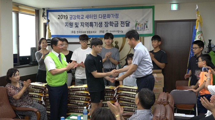 장학금 대상은 체육특기생 3명과 새터민 학생 3명 대학생 1명 다문화가정 학생 1명이다. 그리고 쌀 100포는 다문화 가정과 금강학교에 전달하였다.
