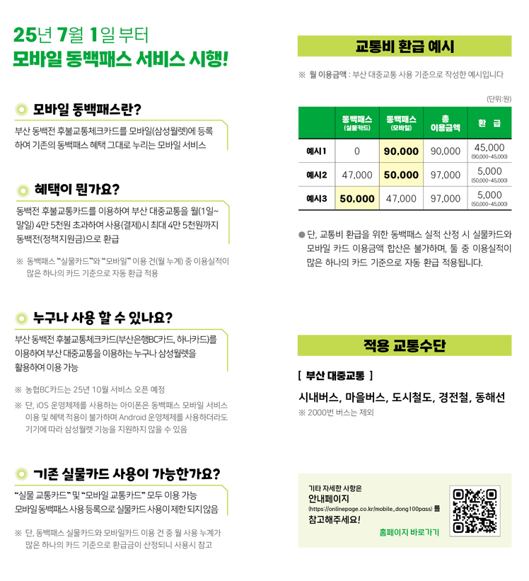 「모바일 동백패스」는 부산 동백전 후불교통 체크카드를 모바일 삼성월렛 앱에 등록해, 실물 카드 없이도 기존 동백패스 혜택을 동일하게 누릴 수 있는 모바일 서비스다. 이번 도입으로 이용 편의성이 향상돼 더 많은 시민이 동백패스 혜택을 누릴 것으로 기대된다.