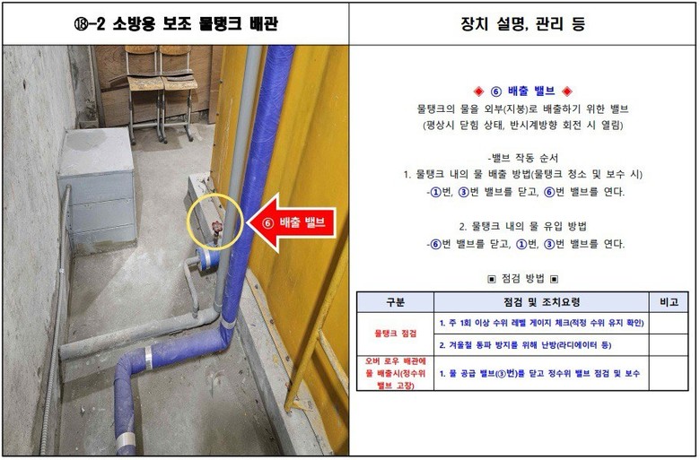 구체적 내용은 ▲화재수신반 오작동 조치 방법 ▲수도 잠금 방법 ▲도시가스 잠금 방법 ▲전기 차단기 조치 방법 ▲옥외 주요시설 배치도 ▲동파 예방 지도 ▲기계설비 현황 ▲물탱크 현황 등으로 실질적인 대응 방법을 포함했다.
