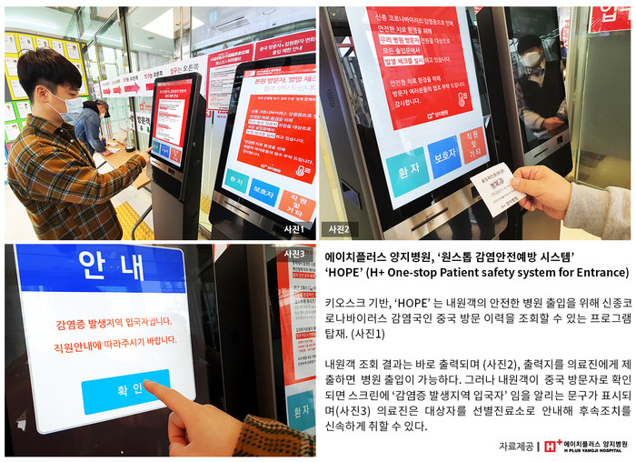 에이치플러스 양지병원이 개발한 ‘HOPE’ (H+ One-stop Patient safety system for Entrance) 는 키오스크 3S (smart, speed, safety) 기반으로 내원객의 안전한 병원 출입을 위해 감염국 방문 이력을 조회할 수 있는 프로그램을 탑재한 ‘원스톱 감염안전예방 시스템’ 이다.