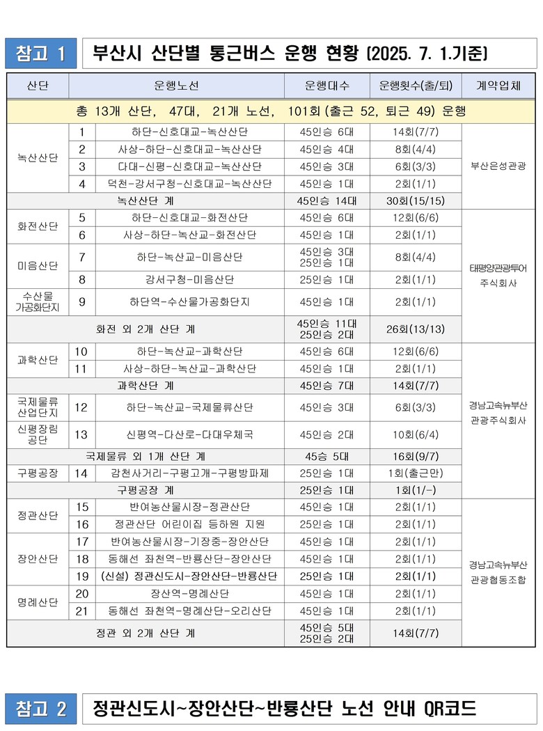 이번 증차로 시 통근버스는 총 47대로 확대, 부산지역 전체 13개 산단을 대상으로 일 101회(출근 52회, 퇴근 49회) 운행된다. 정관신도시~장안·반룡산단을 오가는 신규 노선은 하루 2회(출근 오전 7시, 퇴근 오후 6시) 운행되며, 이를 통해 해당 지역 근로자의 이동 효율성을 크게 높일 전망이다.