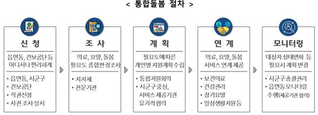 통합돌봄 서비스 신청.접수는 관할 지자체 읍면동 또는 건강보험공단 지사를 방문하거나 우편.팩스를 통해 할 수 있으며, 신청자의 돌봄 필요도 조사와 개인별 지원계획 수립 절차를 거쳐 시군 전담부서에 설치된 통합지원회의를 통해 제공서비스가 최종 확정된다.
