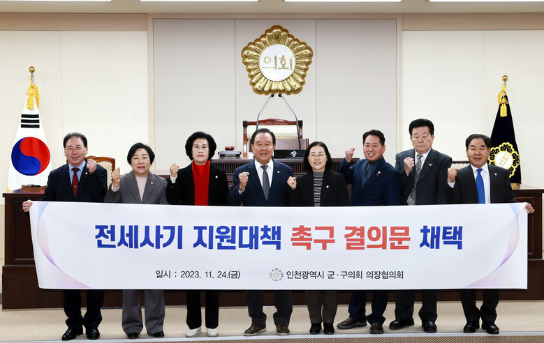 [인천 세계타임즈=심하린 기자] 인천광역시 군·구의회 의장협의회(회장 배상록 미추홀구의회 의장)는 24일 부평구의회에서 11월 월례회의를 개최하고 인천시의 각종 현안에 대해 논의했다. 특히, 이날 회의에서 전세사기 지원 대책 촉구 결의문 채택의 건을 의결했다.