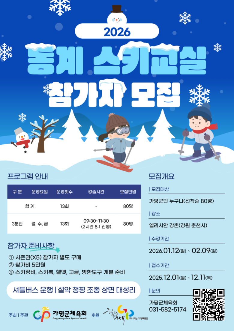 스키교실 참여 대상은 가평군 관내 초등학교 3학년(2016년 12월 31일 이전 출생)부터 성인까지인데, 접수는 12월 1일부터 11일까지 가평군체육회 홈페이지에서 선착순으로 진행한다.
