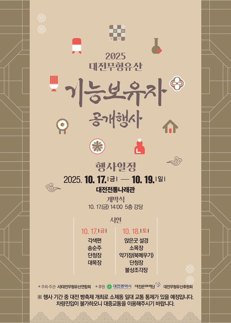 [대전 세계타임즈=이채봉 기자] 대전시는 17일부터 19일까지 사흘 동안 대전전통나래관에서 「2025년 무형유산 기능보유자 합동공개행사」를 개최한다.