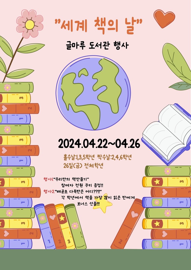 [시흥시 세계타임즈=송민수 기자] 배곧초등학교(교장 김수진)에서는 4월 22일부터 26일까지 5일간 학부모회가 주도하는 세계 책의 날 행사를 운영하고 있다. 2024년 배곧초는 사서교사 미배치교로 학교 도서관 운영을 전 교직원이 함께 협력하며 학부모 명예사서 63명을 활용한 도서 대출 반납, 학부모 도서지원회가 주도하는 다양한 독서프로그램으로 배곧초 학생들의 독서능력 향상을 위해 노력하고 있다.