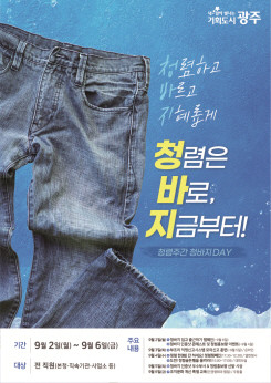 - 청렴골든벨·청바지 인증샷 콘테스트 등 청렴캠페인 다채 [광주 세계타임즈=손권일 기자] 광주광역시(시장 강기정)는 9월 2일부터 6일까지 5일 간을 자체 청렴주간으로 정해 ‘청바지데이’를 운영한다.