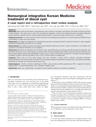 | ▲SCI(E)급 국제학술지 ‘MEDICINE’ 7월호에 게재된 해당 연구 논문「Nonsurgical integrative Korean Medicine treatment of discal cyst: A case report and a retrospective chart review analysis」 |