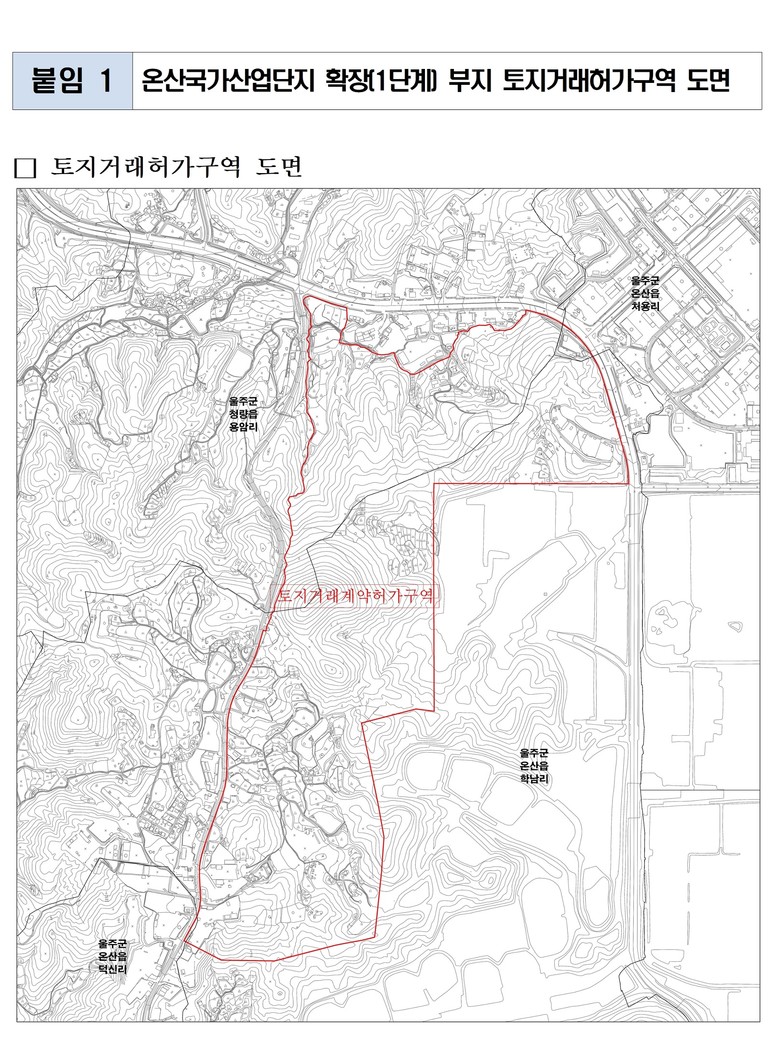 울산시는 오는 6월 17일부터 2028년 6월 16일까지 3년간 울주군 온산읍 학남리 일원 1.41㎢를 토지거래허가구역으로 지정하고 6월 12일 공고한다고 밝혔다.