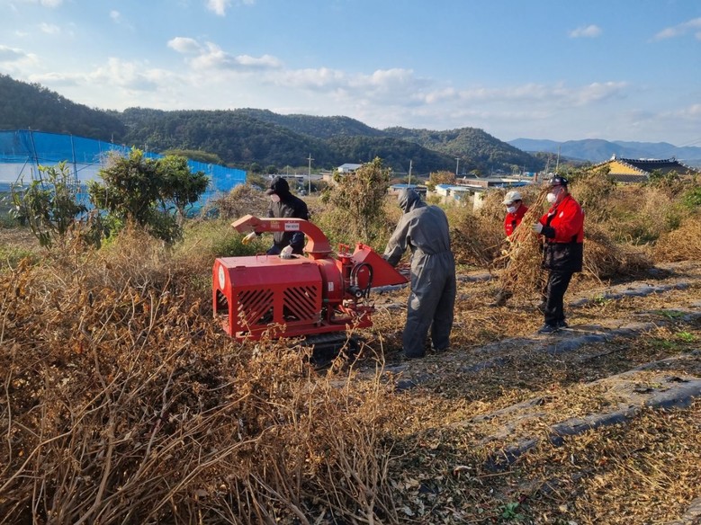 | ▲ 영농부산불 소각으로 인한 산불 발생을 차단하기 위해 파쇄기를 활용한 현장 파쇄 지원하고 있다 |