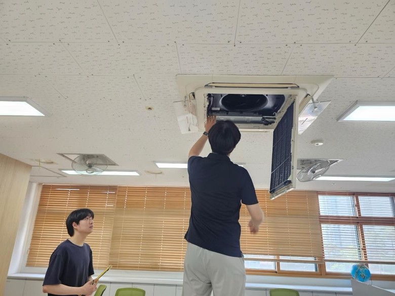 주요 점검 사항은 열교환기 오염 상태, 배수펌프 정상 작동 여부, 교체 필요 부품의 사전 파악, 냉방 성능 확인 등으로 교육청과 냉난방기 제조사가 합동으로 점검한다.