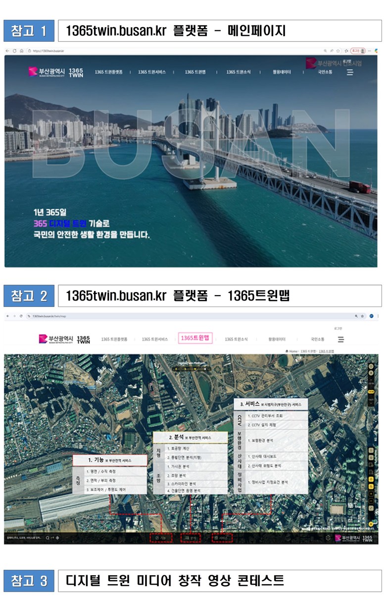 * 1365 트윈 부산 : 1년 365일 가상 모형(디지털 트윈) 기술로 국민의 안전한 생활을 지원한다는 의미
