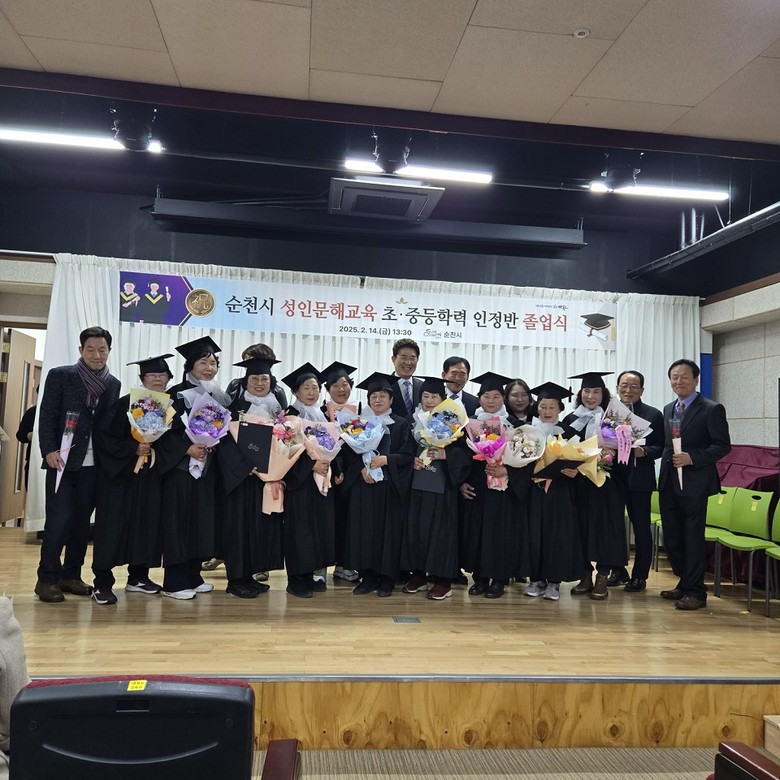 | ▲ 성인문해교육 초중등 학력인정반 졸업식에서 졸업생들이 단체 기념사진을 촬영하고 있다 |