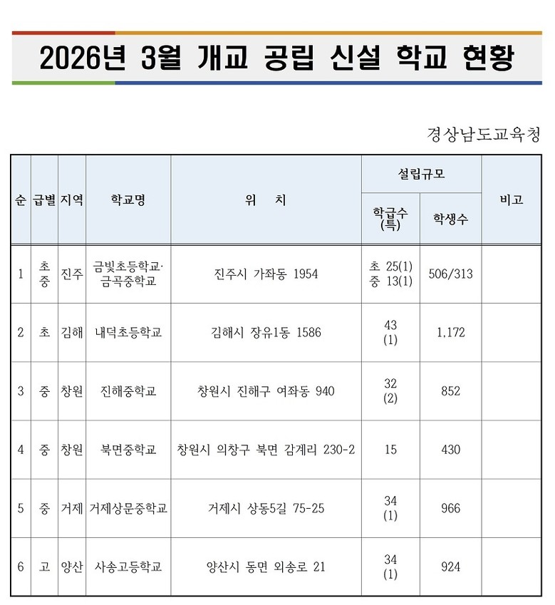 올해 3월 경남에서는 ‘창원 북면중, 진해중’, ‘진주 금빛초·금곡중(초·중 통합학교)’, ‘김해 내덕초’, ‘양산 사송고’, ‘거제 거제상문중’ 등 총 6개 학교가 문을 연다. 경남교육청은 이들 학교를 학생의 상상력과 창의력을 자극하는 '미래형 교육 공간'이자 놀이와 배움이 공존하는 시설로 만들고 있다.