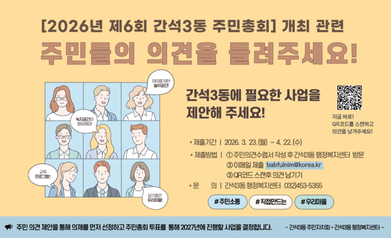 이번 의견수렴은 3월 23일부터 4월 22일까지 30일간 진행되며, 간석3동 주민 누구나 참여할 수 있다.