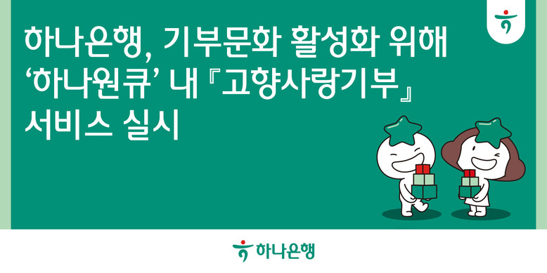 하나은행 디지털채널본부 관계자는 “하나원큐는 대학기부금 이체나 적금을 연계한 종교단체 기부이체 서비스, 탄소중립 실천 포인트 연계, 폐지폐를 재활용한 친환경 베개 머니드림 캠페인 등을 통해 함께 성장하며 행복을 나누는 금융을 실천하고 있다”며, “이번 고향사랑기부를 통해 기부 서비스를 확대하고 앞으로도 나눔문화 확산과 친환경 경영을 실천하는데 앞장서겠다”라고 밝혔다.
