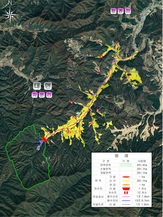 2030년까지 총 391억 원을 투입해 ▴저수지 1개소 ▴이설 도로 1.5km ▴용수로 15.5km를 설치하여, 총 281.1ha의 농지에 안정적인 용수를 공급할 예정이다.