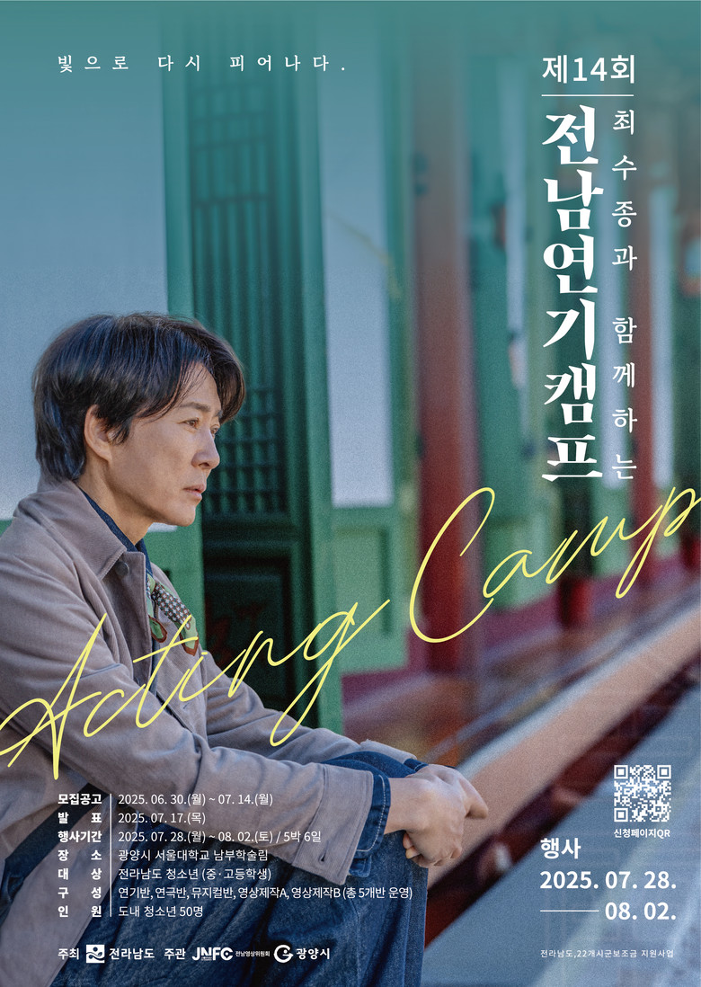 - 연기·연극·뮤지컬·영상 제작 분야 무료로 진로탐색 도와 - [전남 세계타임즈=우덕현 기자] 전라남도와 (사)전남영상위원회가 ‘제14회 최수종과 함께하는 전남연기캠프’ 참가 학생 50명을 14일까지 모집한다.