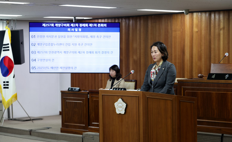 [계양구 세계타임즈=심하린 기자] 인천 계양구의회(의장 신정숙)는 지난 25일 제257회 제2차 정례회 제1차 본회의에서 신지수 의원이 대표 발의한 “진정한 자치분권 실현을 위한 「지방의회법」 제정 촉구 건의안”을 만장 일치로 채택했다.
