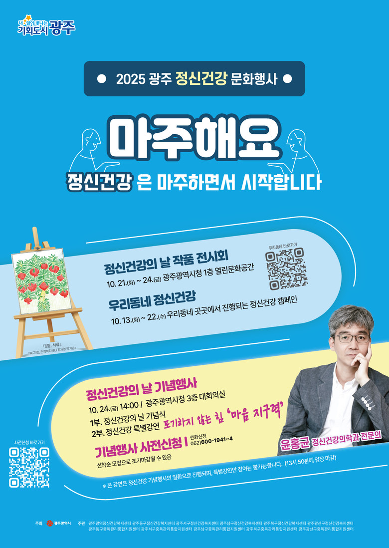 광주광역시가 주최하고 광주광역정신건강복지센터와 5개 자치구 정신건강복지센터, 중독관리통합지원센터가 공동 주관해 열리는 이번 행사는 ‘정신건강은 마주하면서 시작합니다’를 주제로 시민과 함께하는 다양한 프로그램을 선보인다.