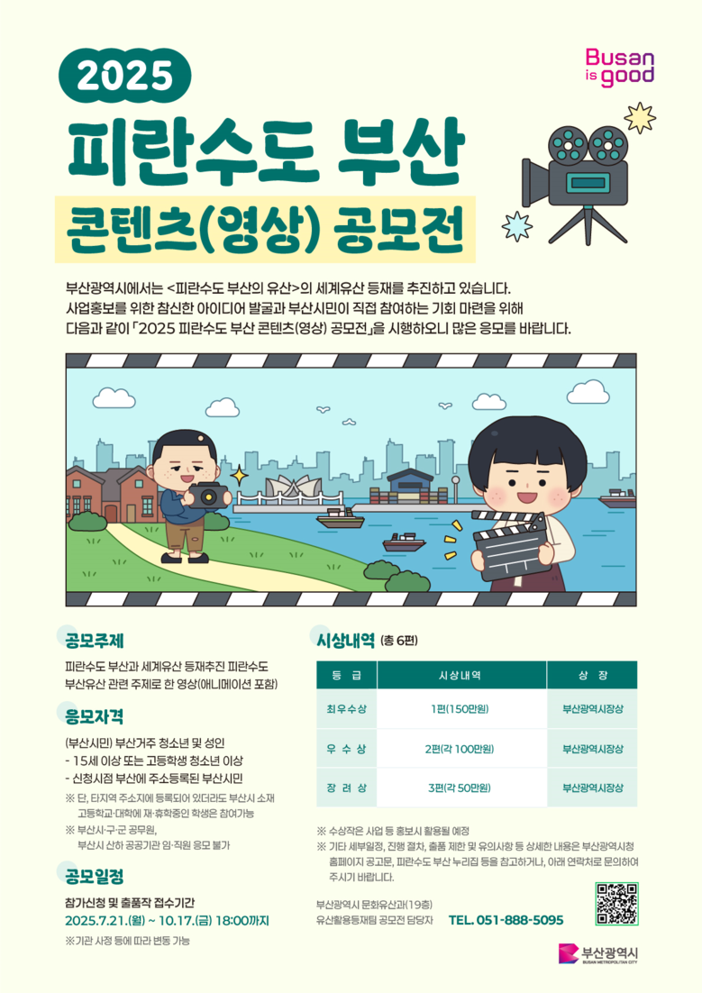 이번 공모전은 피란수도 부산 유산과 세계유산 등재 추진을 주제로, 참신한 아이디어를 가진 15세 이상 부산시민이면 참여할 수 있다. 공모 대상은 영상 분야다.