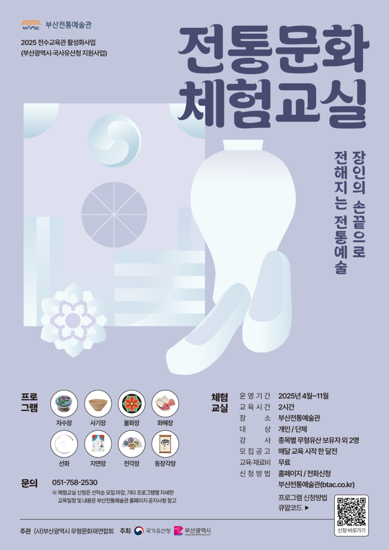 프로그램은 오는 4월 9일부터 11월 8일까지 부산전통예술관에서 진행하며, 매월 1일부터 프로그램별 선착순으로 모집한다. 수강 신청은 부산전통예술관 누리집(www.btac.co.kr)에서 가능하다.