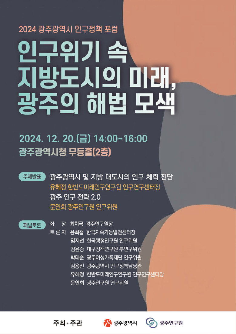 이번 포럼의 주제는 ‘인구위기 속 지방도시의 미래, 광주의 해법 모색’이다. 광주가 직면한 주요 인구문제를 진단하고, 유관기관과 민간 전문가가 함께 해결방안을 논의할 계획이다.