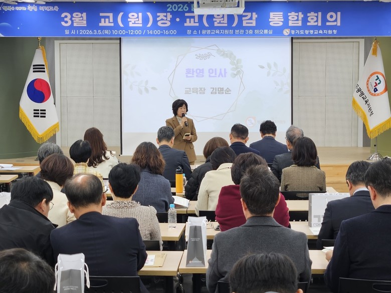[광명시 세계타임즈=송민수 기자] 경기도광명교육지원청(교육장 김명순)은 3월 5일(목), 광명교육지원청 3층 해오름실에서 2026 해오름 광명교육과 경기미래교육 구현을 위한 ‘2026년 3월 교(원)장, 교(원)감 통합회의’를 운영하였다. 이번 통합회의는 학년 초 학교와 교육지원청, 도교육청 간의 협력을 강화하고, 학교 중심의 교육정책, 미래장학, 교육과정운영의 선순환 체제를 통해 학교 중심 행정 지원의 기틀을 마련하고자 진행되었다.