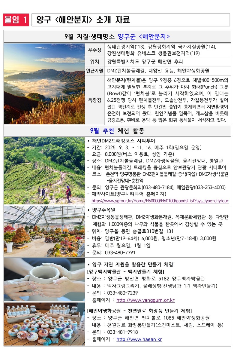 9월에는 해안분지를 중심으로 다양한 가을맞이 프로그램이 운영된다. 대표 프로그램인 △‘해안 디엠지(DMZ) 트래킹코스 시티투어’(9.3.~11.16., 매주 일요일)는 펀치볼둘레길 트래킹과 디엠지(DMZ) 자생식물원, 을지전망대, 양구통일관을 연계해 자연과 역사를 함께 체험할 수 있도록 구성됐다.