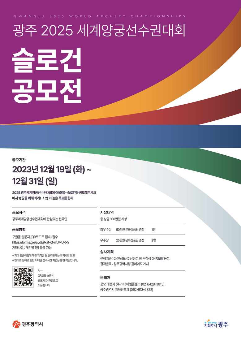 김요성 문화체육실장은 “이번 공모전을 통해 광주시에서 열리는 2025 세계양궁선수권대회에 관심을 가질 수 있는 기회가 되길 기대한다”며 “대회 성공 개최를 위해 공모전에 시민의 많은 참여를 부탁드린다”고 말했다.