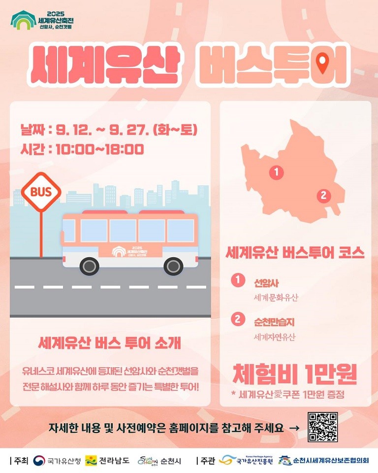 버스투어는 축전기간 매주 화요일부터 토요일까지 총 12회가 운영되며, 선착순으로 회당 18명씩 접수받고 있다. 참가비는 1만원이며, 사전예약은 순천세계유산축전 공식 홈페이지(https://scwhf.com) 또는 축전사무국(061-753-2480)을 통해 가능하다.