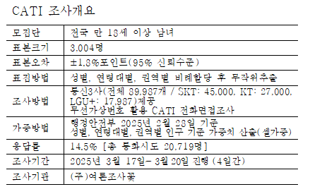 권역별로 살펴보면, ‘더불어민주당’은 호남권에서 72.3%의 압도적인 지지를 얻었으며, 서울(47.7%),경인권(53.6%), 충청권(49.2%)에서도 ‘국민의힘’을 앞섰다. 반면, ‘국민의힘’은 대구·경북에서 54.1%의 지지를 얻으며 강세를 보였다.