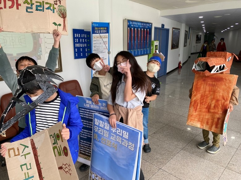 이들 학생은 '흙을 살리는 건 나를 살리는 것'을 주제로 한 선언문과 재활용 상자로 만든 피켓.에코 인형 등을 활용한 퍼포먼스를 펼쳤다.
