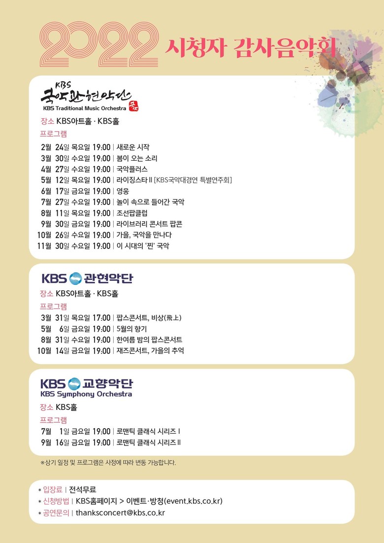 2022 시청자 감사음악회는 오는 11월까지 매달 진행될 예정이다. 공연 관람 신청은 매월 공연 일정에 맞춰 KBS홈페이지 ‘이벤트 방청’ 페이지에서 할 수 있다.