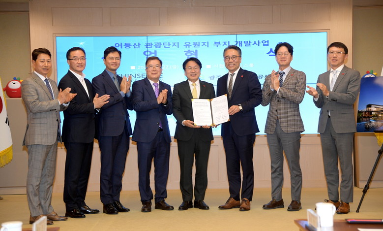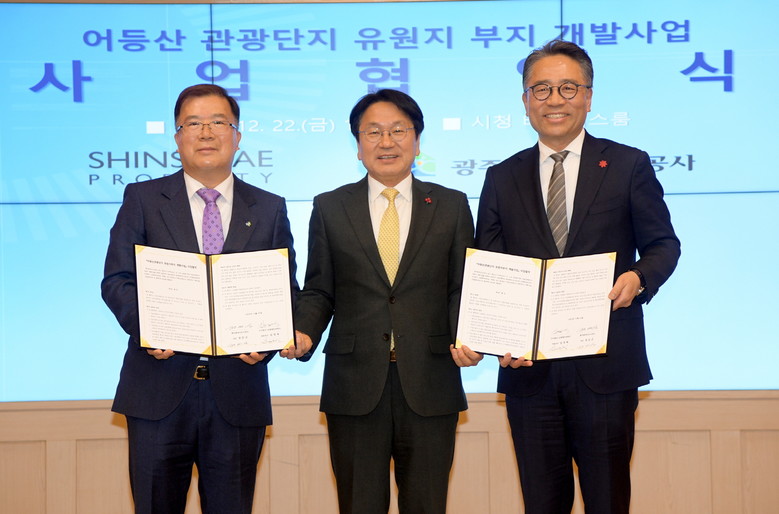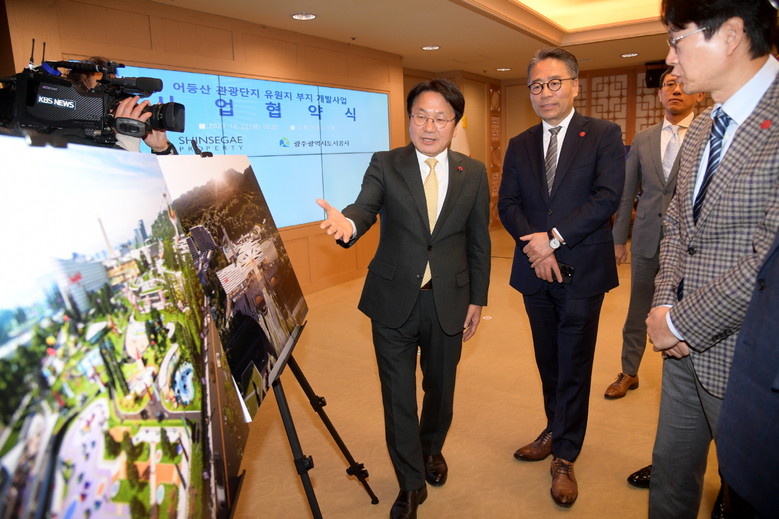 광주광역시(강기정 시장)는 22일 시청 비즈니스룸에서 광주광역시도시공사와 ㈜신세계프라퍼티가 어등산관광단지 유원지 부지개발을 담은 ‘어등산관광단지 유원지부지 개발사업 사업협약’을 체결했다.