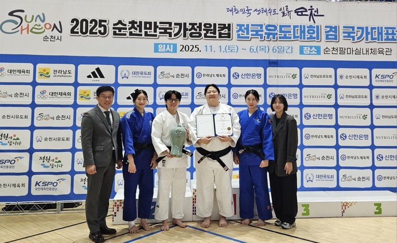 | ▲ 지난 1일 순천시청 신채원 선수(우측에서 2번째)가 순천에서 열린 2025 순천만국가정원컵 전국유도대회에서 개인전 동메달 수상 기념사진을 촬영하고 있다 |