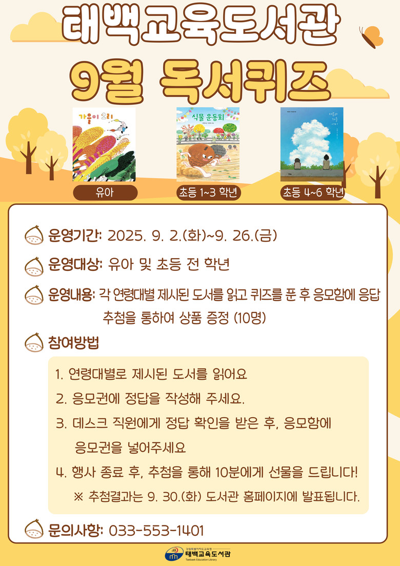 ‘9월 독서퀴즈’는 어린이들이 책을 읽고, 내용을 바탕으로 퀴즈를 풀어보는 활동을 통해 독서에 대한 흥미를 높이고, 독해력과 사고력을 키우기 위해 마련된 프로그램이다.
