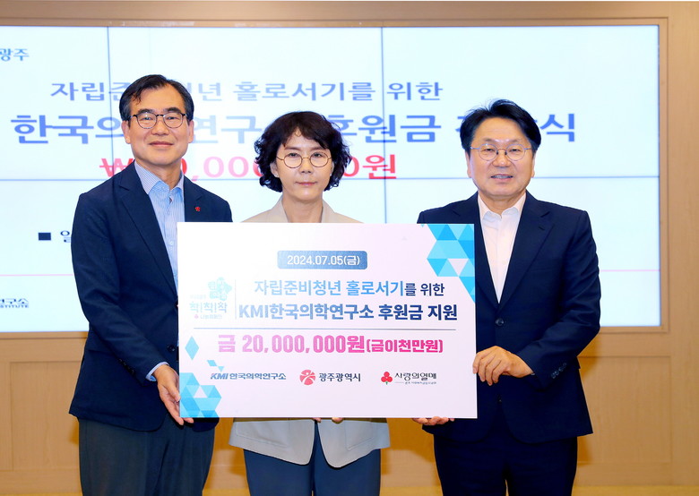 광주광역시(시장 강기정)는 5일 시청 비즈니스룸에서 (재)KMI한국의학연구소, 광주사회복지공동모금회와 함께 후원금 전달식을 가졌다.