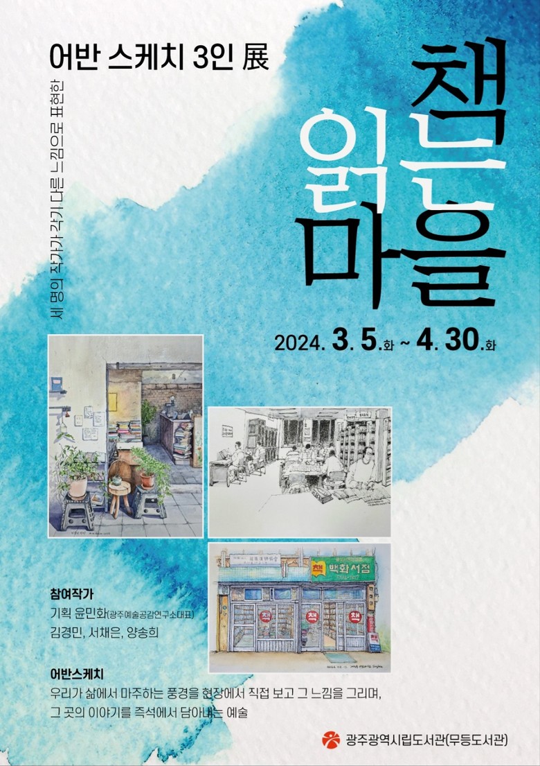 [광주 세계타임즈=손권일 기자] 광주광역시무등도서관은 오는 4월 말까지 어반스케치 3인전 ‘책 읽는 마을 전시회’를 개최한다.