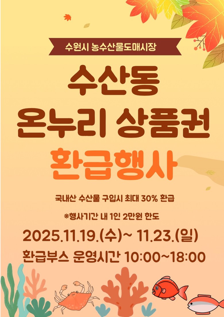 수원시 관계자는 “국내 수산물 소비를 활성화하고, 소비자가 저렴한 가격에 수산물을 구매할 수 있도록 온누리상품권 환급행사를 연다”며 “많은 분이 수원시농수산물도매시장을 찾아주시길 바란다”고 말했다.