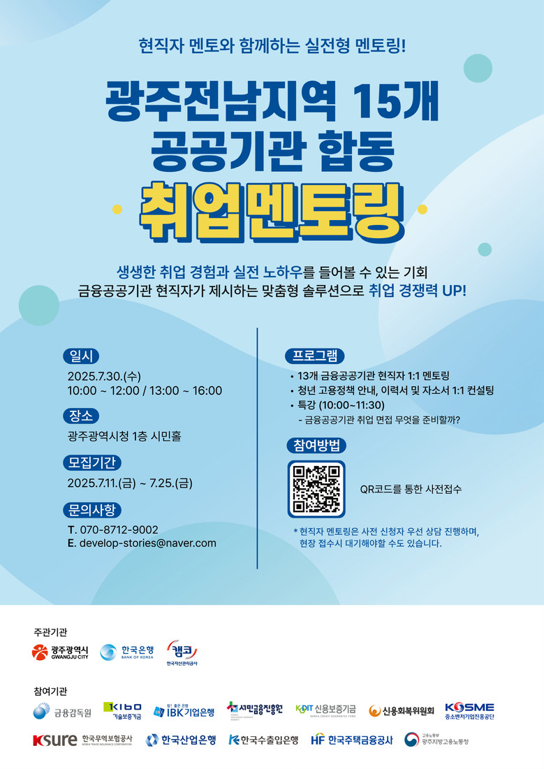 - 현직자 1:1 멘토링, 자기소개서‧면접 전략 등 실전 노하우 제공 [광주 세계타임즈=손권일 기자] 광주광역시(시장 강기정)는 지역 청년들의 금융공공기관 취업을 지원하기 위한 ‘광주전남지역 공공기관 합동 취업멘토링’ 행사를 30일 시청 1층 시민홀에서 개최한다.